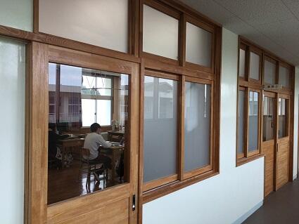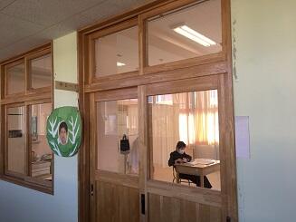 現在、高等部普通科の生徒たちが「われらのまなびや整備活動支援事業」を利用して、自分たちで校内の各教室表示を見やすく触りやすいものに整備しています。役割分担して、作業を進める様子はとても頼もしいです。