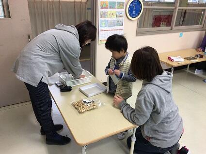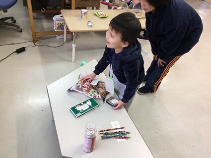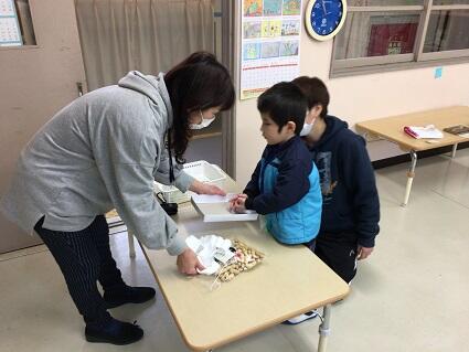 今日は、幼稚部が近くのスーパーアタックスへ買い物へ行く予定でしたが、雨が降り始めたので教室で模擬の買い物学習をしました。節分の行事にむけて、それぞれに買う品物が決まっていたので、本番と同じように教室内に置かれたいろいろな品物の中から自分の買うものを探して、簡易レジでお金を支払いました。それぞれが先生と一緒に楽しみながら活動している様子に、とても嬉しくなりました。