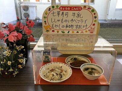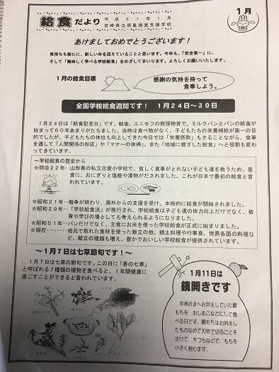 1月の給食だよりが配付されました。食事に関する季節の行事や栄養など食事に関する知識が毎月書かれています。みんなの健康を支えたい、守りたいという栄養教諭の先生の思いです。1月号には学校給食の歴史をはじめ、七草節句や鏡開きのことが書かれています。それぞれが大切にしたい季節の行事です。そして、今日の給食は「七草寿司」でした。子どもたちも職員も1年間健康に過ごすことができると思います。