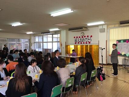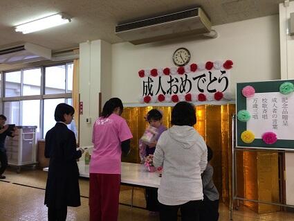 今日は成人の日です。本校でも成人を祝う会を行いました。在校生と卒業生の3名が二十歳の成人を迎えます。体調や所用等もあり、今日は1名が出席しました。きれいに着飾った姿で入場すると、「わぁ~きれ~い」という声が会場のあちこちから聞こえてきました。PTA会長の挨拶に始まり、元PTA会長の乾杯、中学部、高等部の出し物などがあり、来賓やPTA、職員がみんなで祝うとても温かい会でした。成人者は、それぞれが健康に気をつけながらこれからの未来を切り開いて、夢や願いをかなえて欲しいです。