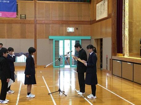 昨日の5校時に生徒会役員の就任式と退任式を行いました。今までの役員のみなさん、お疲れ様でした。そして、ありがとうございました。これまでの1年間、月の目標を決めたり、様々な行事を企画して、取り組んだりしてきましたね。明るく活気ある学校になったのはみなさんのおかげです。新しい役員の皆さんこれからの1年間をよろしくお願いします。早速、球技祭が行われますね。生徒会に必要な力は「積極性」、「表現力」、「行動力」の3つです。未来につながる学校づくりをよろしくお願いします。