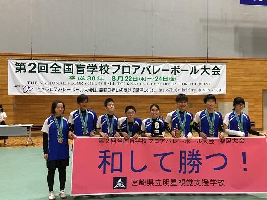 平成30年8月22日(水)~24日(金)に、第2回全国盲学校フロアバレーボール大会がアクシオン福岡会場で行われました。北海道ブロックから九州ブロックまで、各ブロックを勝ち上がってきた代表9校が戦いました。その大会で、本校は全国3位を勝ち取ることができました。昨年まではなかかなか上位までいくことが出来ませんでしたが、監督を中心とした周りの先生方の声かけや練習の工夫により、生徒たちの本気の心と技術が大きく成長しました。試合は喜んだり、悔しがったりと生徒たち一人一人のドラマがありました。大きな挑戦と大きな成果を嬉しく思います。監督をはじめ、生徒たちや練習を支えていただいたすべての方々に感謝申し上げます。