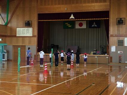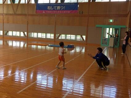 体育館の端から反対側の端にいる先生の元へ一人で走っていきます