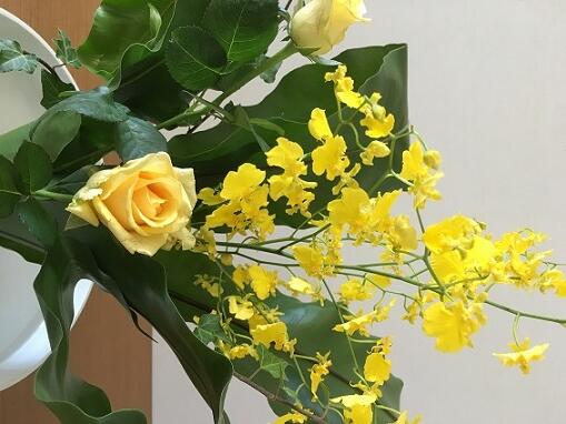 校長室に新しい花が飾られました。バラ、オンシジューム、タニワタリ、アイビーの生け花です。梅雨の中に黄色い色がとても爽やかです。オンシジュームの花言葉は「可憐」、「一緒に踊って」という意味だそうです。白い花器の中に生けられているそれぞれの花が一緒にハーモニーを奏でて踊っているように見えます。本校の今も未来もそうありたいです。