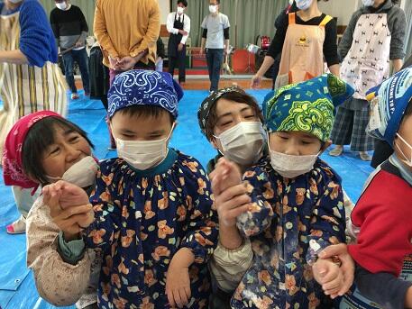 今日は、幼稚部が住吉幼稚園との餅つき交流を行いました。年越しに餅をつくという伝統行事は、時代の流れとともに、どの家庭でも年々少なくなってきています。住吉幼稚園は様々な行事の体験をとても大切にされており、餅つきもその一つです。今日は先日の芋掘り交流に続き、住吉幼稚園の餅つきに参加させていただきました。幼稚部の子どもたちは、粉で手や顔を白くしながら、楽しそうに餅をついたり、丸めたりしていました。餅つきの後はクラスでゲームをしました。幼稚園の先生の言葉かけや指示の仕方、間の取り方などは、とてもわかりやすく、私たちの勉強にもなりました。幼稚部の保護者の方も参加され、嬉しそうに見ておられたのが印象的でした。住吉幼稚園の先生方、本当にありがとうございました。
