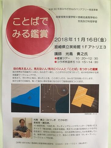 京都の美術家「光島貴之/みつしまたかゆき」先生を講師にお招きして、本校中学部・高等部生徒と宮崎北高等学校の生徒で「ことばでみる美術鑑賞」を県立美術館で行いました。目の見えない、見えにくい者と見える者が一緒に、ことばやからだを使って、絵の中を探検する美術鑑賞ワークショップです。絵から受けた印象をことばで伝え合います。本校の生徒たちの障がいに正面から向き合って、「共に生きる」を教育で具現化しました。「共に生きる」上で本当に大切なことを、互いが感じあったようです。
