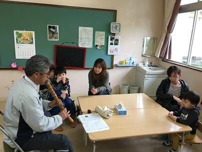 今日、早期教育相談きらきら教室で尺八を聴きました。本校の先生で尺八をされている方がいます。尺八を聴かせて欲しいとお願いしていたところ今日実現しました。尺八で、「大きなくりの木の下で」や「かもめの水兵さん」などを吹いてもらいました。独特な音色と節回しに子どもも保護者も興味津々です。なかなか聴く機会の少ない楽器です。いろいろな楽器の音を小さい頃から聴かせたいときらきら教室の先生方はおっしゃっていました。