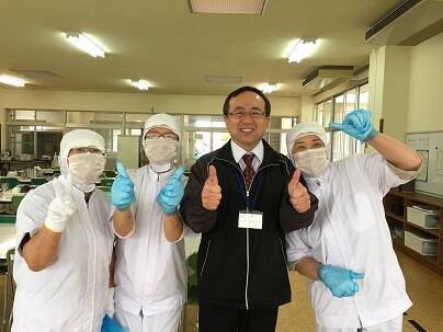 今日は、今年度最後の給食でした。校長と教頭が給食を食べていると、給食の調理員の方々が挨拶に来てくれました。いつもおいしい給食を作ってくださる方々です。できるだけ手作りのものを食べさせたいと話され、給食の時間はいつも笑顔で子供たちや職員へ声をかけてくださいます。今日は、みんなの大好きな教頭先生を囲んで写真を撮らせていただきました。