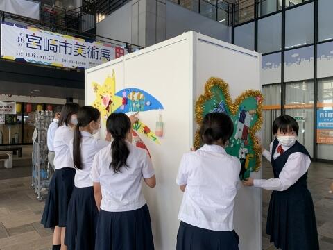 1()の午後、みやざきアートセンターの「太陽の広間」にて、作品展示を行いました。作品は、アートフェスティバル会場のシンボルとして、本校普通科5名と宮崎北高校の美術部生徒8名とで共同制作したものです。