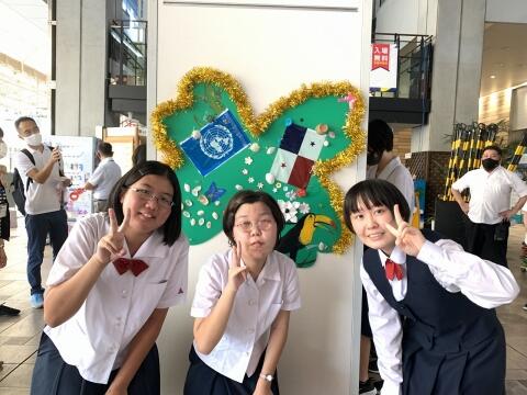 9月には美術館で共同制作の予定でしたが、新型コロナに伴う蔓延防止対策のため残念ながら中止し、各校で分担して作業しました。10月1日の展示活動日は蔓延防止対策期間があけたため、感染症対策をしっかり行いながら、会場に集まって活動することができました。