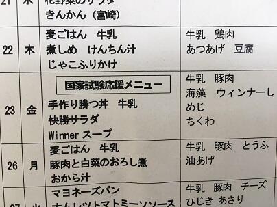 今日の給食は理療師国家試験応援メニューでした。栄養教諭の先生の心遣いです。