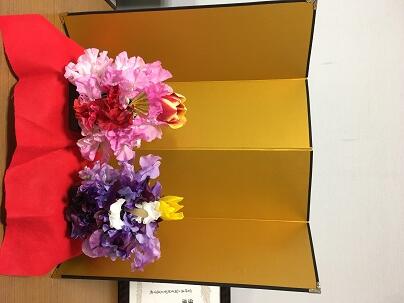 男雛は紫のスイトピーで裃(かみしも)をつけたように生けられています。女雛はピンクのスイトピーで十二単を着たように生けられています。会議や来訪者の多いこの時期に、校長室へ入室された方は、まず驚き、そして笑顔になります。色彩を大切にする視覚支援学校でありたいです。
