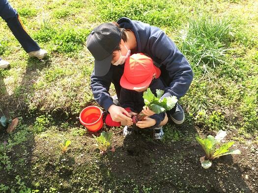 今日はお天気も良く春の陽気です。幼稚部の子どもたちがカブとブロッコリーの収穫をしました。自分たちで畝を作り、種をまいたものが大きくなりました。カブとブロッコリーも収穫できそうです。両手で形や大きさを確認しながら収穫していました。「土がついてる!」「まるいね!」「たくさんある!」いろいろな言葉が子どもたちの口から出てきます。地についた体験が地についた芯のある言葉になっていきます。