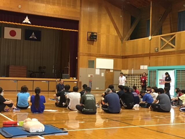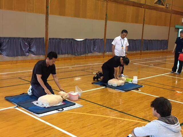 平成29年6月1日に救急法研修会を体育館で行いました。応急手当研修センターから2名の