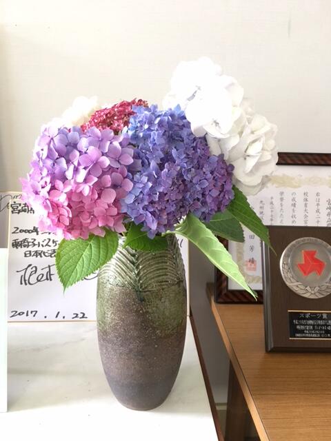 室にも、今朝、事務室の先生が、この様々な色のあじさいを飾ってくださいました。季節ごとの