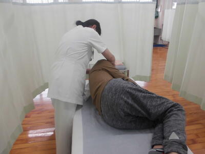 今回参加した生徒は専攻科理療科1名、専攻科保健理療科1名の計2名。施術は前半と後半の2回に分けて実施しました。