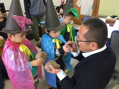 今年開設した幼稚部がハロウイン祭りをしました。自分たちで育てた大きなサツマイモを校長室まで届けてくれました。また、校長室に来るまでに、職員室や事務室に立ち寄り「Trick or Treat!」と声をかけていました。子どもたちにとっては初めてでドキドキの挑戦でした。他学部や事務室の先生たちは嬉しそうに話しかけたり、準備していたお菓子を渡したりしていました。幼稚部があればこその光景でした。子どもたちや先生方の優しい眼差しと笑顔を見ることができて、とても嬉しく思いました。そして、事務室の先生方が参加してくださったことが本当に嬉しく、新しい学校の雰囲気がまたできました。ありがとうございました。