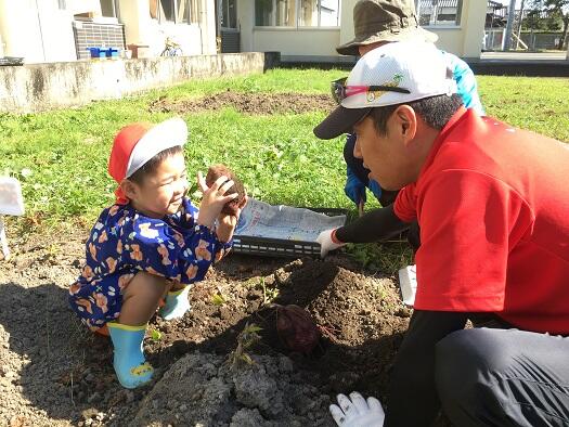 「顔くらい大きなお芋がでてきたよ」と嬉しそうに話す幼児(中学部数学科の先生と一緒に)