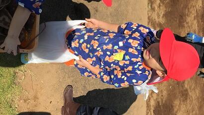 今日は天気もよく幼稚部の子どもたちは校内でお芋掘りをしました。子どもたち自身は楽しみながらの芋掘りですが、活動の中に教科の要素がたくさんちりばめられています。今日の芋掘りには、中学部と高等部の数学の先生が参加しています。子どもたちと向き合いながら一緒にお芋を掘っています。子どもたちの口からは、「つるがなが~い!」「細長い形だよ」、「3個でてきたよ」、「深く掘ってみよう」「こっちのお芋が大きい」などの言葉がどんどん出てきます。数学の先生たちが意図しながら問いかけたり、一緒に触ったりしているのです。教科の基礎を幼稚部から育てたいという、学部の枠を超えた本校ならではの教育です。今日来ているスモックも高等部3年生が家庭科の時間に作ったものです。枠を超えた繋がりが本校の大きな魅力です。