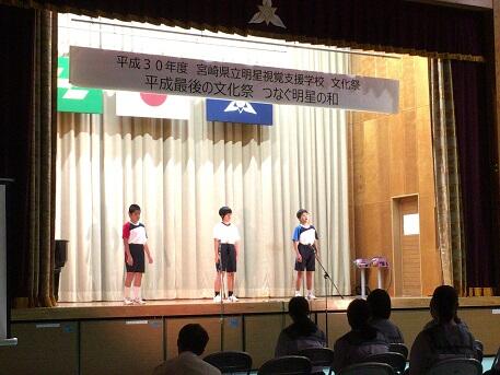 今年の文化祭の練習が始まりました。テーマは「平成最後の文化祭! つなぐ明星の和」です。生徒たちからの発案で決まりました。今日は、早速合同合唱の練習が始まりました。昼休みに、小学部、中学部、高等部、理療科の児童生徒たちが練習しています。今年の合同合唱は「翼をください」です。一人一人が翼を広げ、伸び伸びと翔ける文化祭にして欲しいです。それぞれの学部の演目が楽しみです。