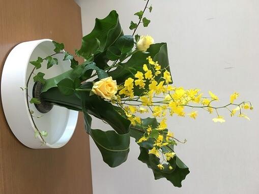 校長室に新しい花が飾られました。バラ、オンシジューム、タニワタリ、アイビーの生け花です。梅雨の中に黄色い色がとても爽やかです。オンシジュームの花言葉は「可憐」、「一緒に踊って」という意味だそうです。白い花器の中に生けられているそれぞれの花が一緒にハーモニーを奏でて踊っているように見えます。本校の今も未来もそうありたいです。