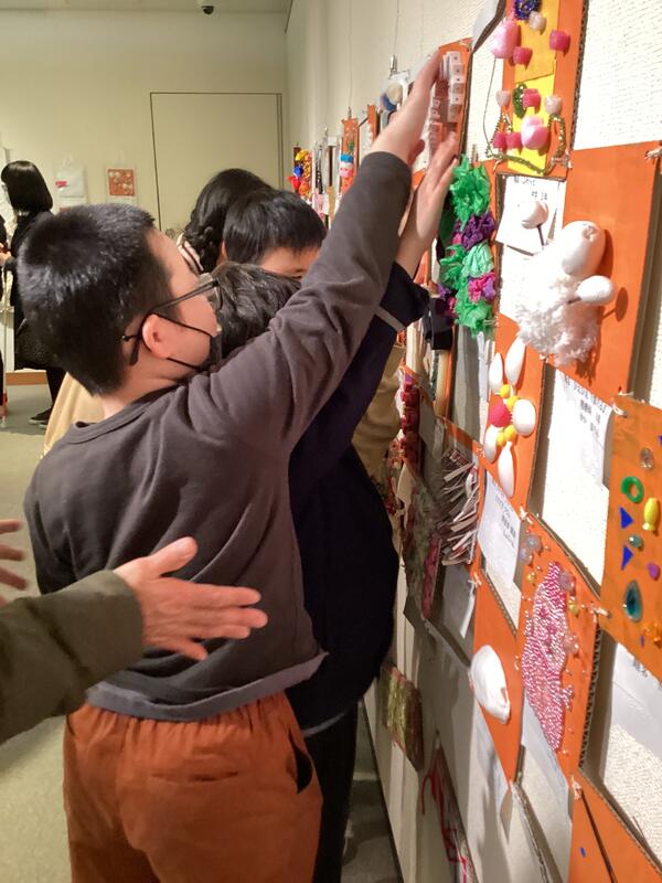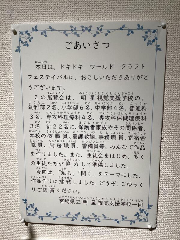 本年度、近隣の高鍋町美術館で明星視覚支援学校の幼児児童生徒・全職員・保護者及び家族が一体となり、美術展覧会を開催することができました。開催に当たって、必然的な出会いがありました。1学期に本校を見学された高鍋町美術館の学芸員の方が高鍋町美術館の展示物を立体コピーを使って説明したいということで、本校の立体コピーをお貸ししたことがきっかけです。本校のこどもたちの作品を展示させていただけないかとお願いしたところ、快くお返事いただきました。高鍋町教育長のご理解もあり、高鍋町美術館の回廊で明星の展覧会『ドキ★フェス』を開催することができました。