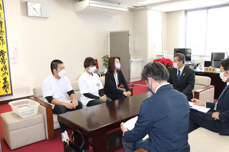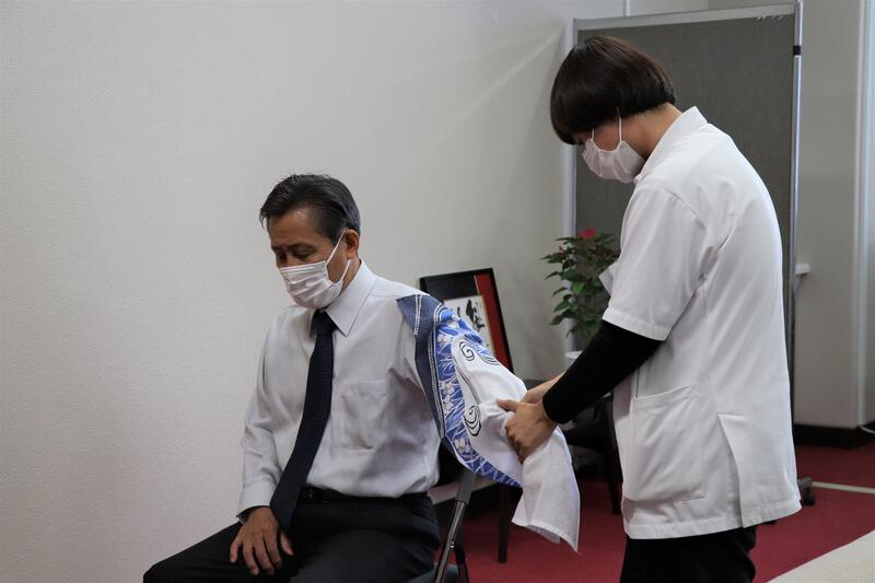 本年度は、黒木教育長をはじめ、児玉教育次長、小牧総務次長、障害福祉課の方々に臨床実習をさせていただくことができました。ヘルスキーパーについても十分理解していただきました。理療科3年の2人は緊張しながらも丁寧に施術をすることができ、貴重な体験となり自信をつけることができました。「よくコミュニケーションをとりながら施術いただいたので、リラックスして過ごせました。」「施術だけでなく、人柄のおかげでとてもいい時間を過ごせました。」「リフレッシュできました。」などの感想をいただきました。御多用な中、実習をさせていただき感謝いたします。
