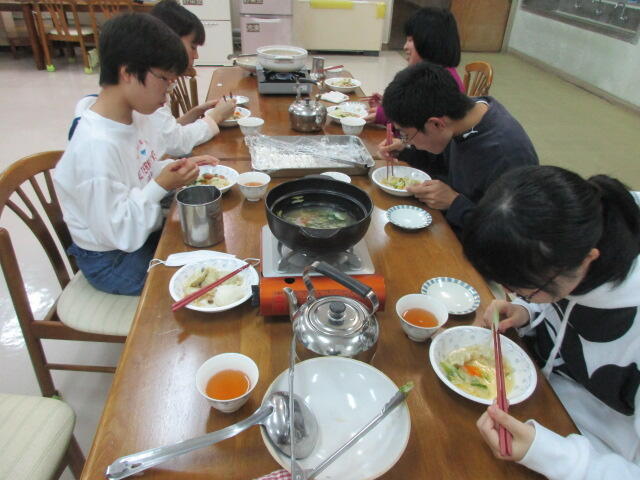 寄宿舎の夕食は「水餃子の鍋パーティー」でした。昨日は、夜になるとグッと気温も下がり「ポカポカ」体を温めるには絶好の「鍋日和」でした。はじめて寄宿舎で鍋料理を食べるので、寄宿舎指導員の先生方のご協力もあり無事に実施することができました。子どもたちの中には、水餃子をはじめて食べる生徒も多く、いろんな食材に触れる貴重な時間となりました。お肉は勿論ですが、野菜や豆腐などが見る間に減っていき、会話も弾み楽しい鍋パーティーになりました。 これからどんどん寒くなってきますが、いろんな鍋料理を食べてもらいたいと思います。