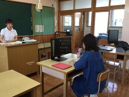 本年度から、教育相談の一環として取り組み始めた生活相談コースの様子です。社会自立を目指して、卒業生や中途障がいの方を対象に毎週火曜日に行っています。4、5月に本人や保護者の方をはじめ、関係機関との拡大支援会議を行いながら、スケジュールを立てました。このコースは、これからの本校の在り方についての実践研究の大きな意味も持っています。このコースに協力いただいている卒業生生徒と保護者の方に心よりお礼申し上げます。今日は、宮崎商業高校からのアドバイスをもとに、いただいたテキストを参考にしながら、面接に必要な知識やスキルを学習していました。社会に飛び立つ大切な滑走路の役割を果たしたいと思います。