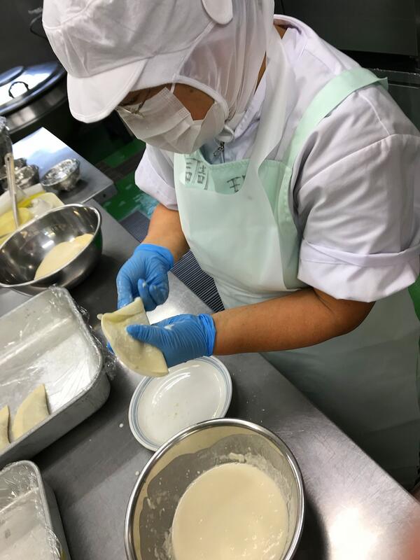 子どもたちに大人気の「ジャンボ餃子」です。餃子は通常8cmの皮で包みますが、本校で使用する餃子の皮は15cmの特注品です。調理員さんが一つ一つ丁寧に包みました。