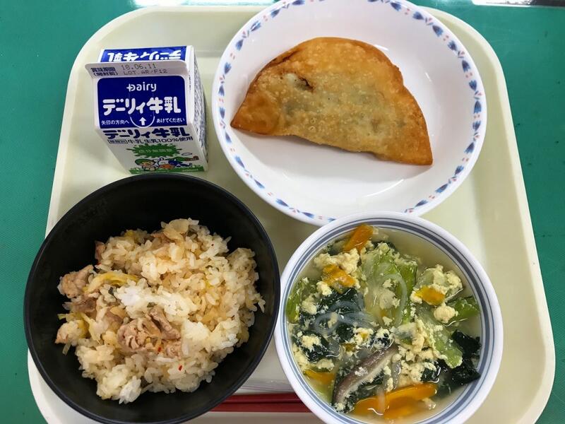 献立は、キムタクごはん・牛乳・ジャンボ餃子・かき玉汁です
