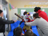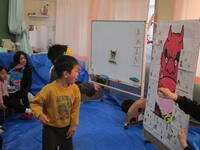 子どもたちは怖がりながらも、「鬼は外!!」と、豆をまいて立ち向かいました。