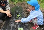 5月30日(木)に「さつまいもの苗植え」をしました。初めに、プレイルームで模型の畑に苗を植える練習をしました。ポイントは「斜めに植える。」でしたが、皆上手に練習ができました。