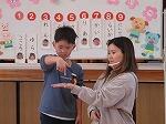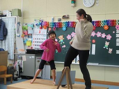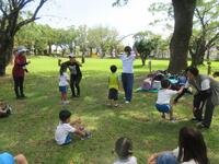 お弁当とお菓子を食べた後は、親子ふれあい遊びをしました。今日見たたくさんの動物や乗り物の動きを一緒に考えて再現してもらいました。ゾウ、フラミンゴ、ペンギン、サル、ゴーカート、メリーゴーランド・・・親子でいろいろと話し合いながら、みんな上手に真似をすることができていました。一家族ずつ発表してもらうと、みんなから「おおーっ。」という歓声や笑い声があがっていました。