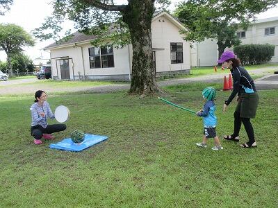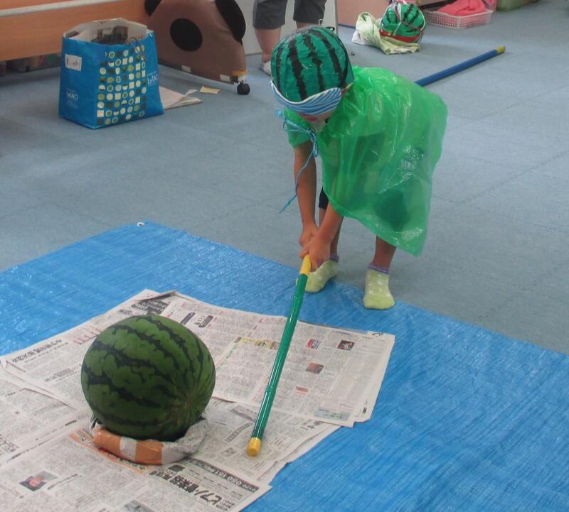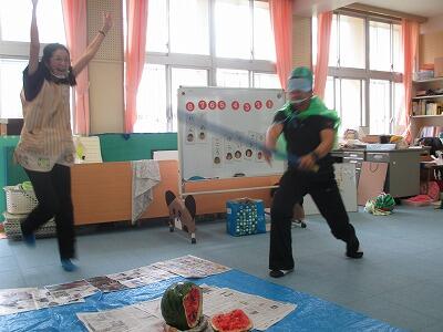 お昼ご飯を食べて、少しゆっくりしたら、すいか割りです。アイマスクをつけて、太鼓の音を手掛かりに進みます。