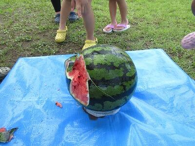 子ども達みんな挑戦しましたが、なかなか割れないスイカ・・・。最後は先生の出番です。