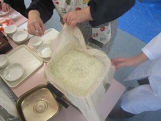 給食ができるまでのお話を聞いたり、給食を作る様子を見せてもらったりしました。