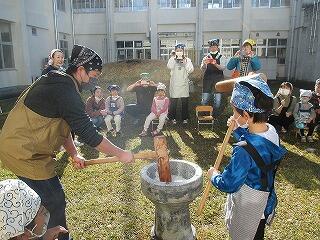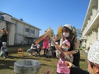 12月6日(金)に毎年恒例の「もちつき会」が行われました。幼稚部の「もちつき会」の歴史は長く、多くの先輩方が経験してきた大きな行事です。この日は天候にも恵まれ、屋外での「もちつき会」が実施できました。今ではなかなか見かけなくなった「石の臼」と「木の杵」を使っての「もちつき会」では、保護者の方も子供たちも全員杵をもって交替で餅つきを行いました。みんなの力が合わさって、しっとりとした柔らかいお餅ができました。餅がつきあがると親子で餅を丸め、好きな味(きなこ・醤油・砂糖醤油・チーズなど)でつきたてのお餅を堪能しました。お腹いっぱいになった後は、全員で片付けも行いました。鏡餅や食べるお餅がたくさん出来上がった思い出に残る行事となりました。