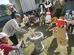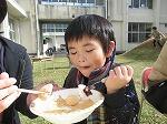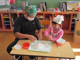 1月15日にかがみ開きをしました。かがみもちの中には神様が宿っていることや、そのおもちを食べると強い体になるというお話を聞きました。子どもたちは、興味津々でお話を聞いていました。いよいよ、かがみもちを木づちで割る時間には、木づちに当たったもちがコロンコロンと転がって、なかなか割れません・・・。みんなで順番に木づちを振りました。最後に割れて大喜びでした。醤油やきなこで味付けしたおもちの味は格別でした。みんな元気におかわりをしました。「もっと食べたいな~」と言いながら、ごちそうさまをしました。