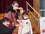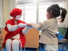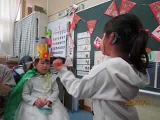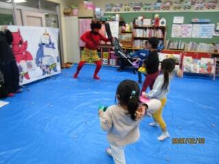今年も幼稚部では豆まきをしました。この日までに「自分のお腹の中にはどんな鬼がいるのかな?」「豆をまく時は何て言うの?」「鬼はどこにいると思う?」など、いろいろな場面で話合いを重ねてきました。学級ごとに鬼のお面を作り、豆まきシュミレーションをした学級もあったようです。そして、いざ本番!いつもと違うプレイルームに集まった時から、背後を気にしつつソワソワする子ども達。2匹の赤鬼が登場すると、お母さんや先生の後ろに回りこんで逃げる子、泣き出す子、果敢に豆を手に立ち向かう子。みんなそれぞれでしたが、最後は力を合わせて鬼を追い出すことができました。一安心していると、優しいお顔の福の神がやってきてくれました。終始緊張の面持ちでしたが、終わった後はみんな一回りたくましくなったように感じました。お腹の中の鬼も退治して、今年も一年、元気に楽しく過ごせるといいですね。