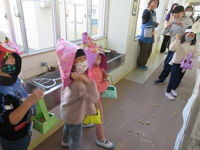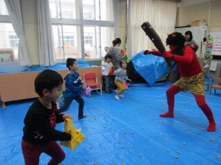いっしょうけんめい みんなで おにに まめを なげたよ。