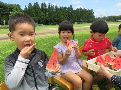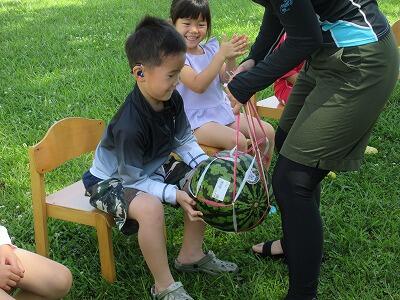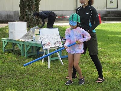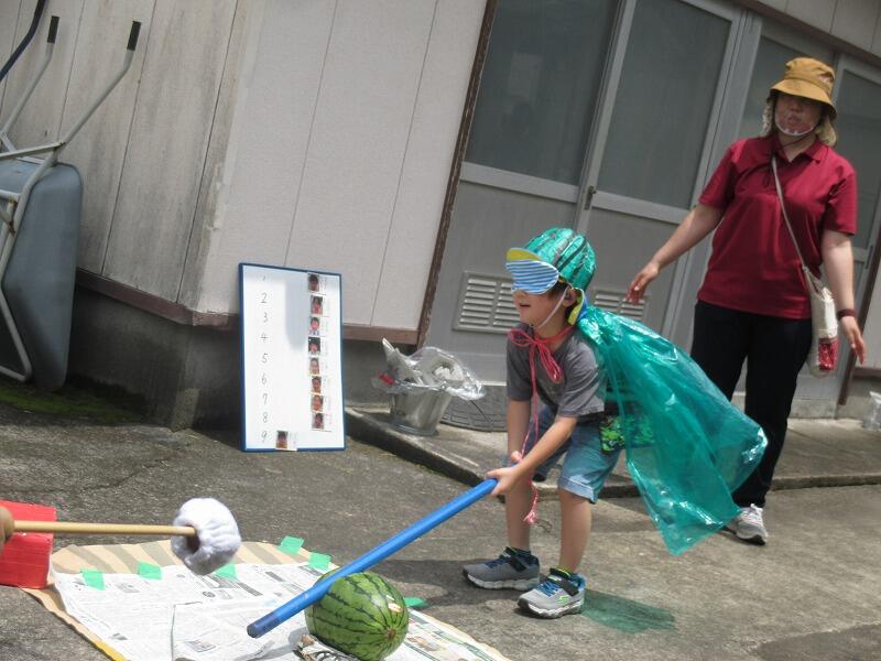 お昼ご飯を食べて、少しゆっくりしたら、すいか割りです。アイマスクをつけて、太鼓の音を手掛かりに進みます。