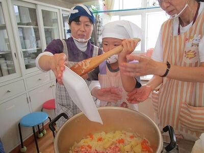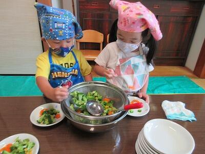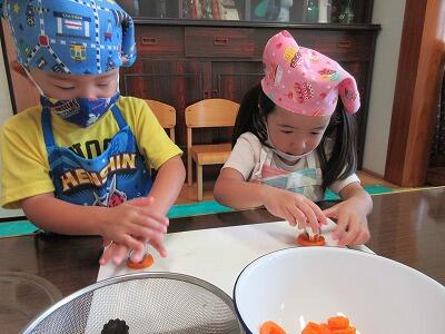 年少組は、レタスちぎり、年中・年長が包丁を使いました。ルーも入れて完成しました。