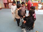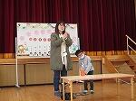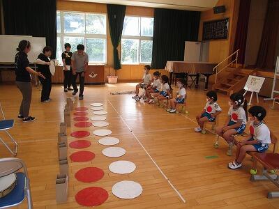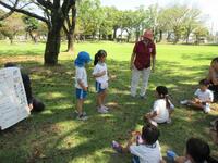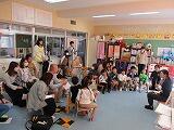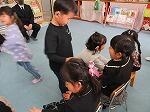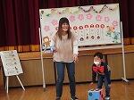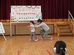 お弁当とお菓子を食べた後は、親子ふれあい遊びをしました。今日見たたくさんの動物や乗り物の動きを一緒に考えて再現してもらいました。ゾウ、フラミンゴ、ペンギン、サル、ゴーカート、メリーゴーランド・・・親子でいろいろと話し合いながら、みんな上手に真似をすることができていました。一家族ずつ発表してもらうと、みんなから「おおーっ。」という歓声や笑い声があがっていました。