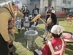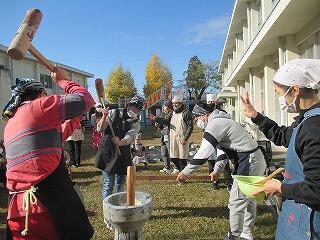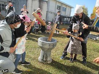 12月6日(金)に毎年恒例の「もちつき会」が行われました。幼稚部の「もちつき会」の歴史は長く、多くの先輩方が経験してきた大きな行事です。この日は天候にも恵まれ、屋外での「もちつき会」が実施できました。今ではなかなか見かけなくなった「石の臼」と「木の杵」を使っての「もちつき会」では、保護者の方も子供たちも全員杵をもって交替で餅つきを行いました。みんなの力が合わさって、しっとりとした柔らかいお餅ができました。餅がつきあがると親子で餅を丸め、好きな味(きなこ・醤油・砂糖醤油・チーズなど)でつきたてのお餅を堪能しました。お腹いっぱいになった後は、全員で片付けも行いました。鏡餅や食べるお餅がたくさん出来上がった思い出に残る行事となりました。