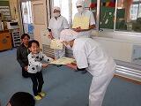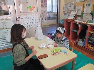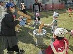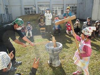 1月15日にかがみ開きをしました。かがみもちの中には神様が宿っていることや、そのおもちを食べると強い体になるというお話を聞きました。子どもたちは、興味津々でお話を聞いていました。いよいよ、かがみもちを木づちで割る時間には、木づちに当たったもちがコロンコロンと転がって、なかなか割れません・・・。みんなで順番に木づちを振りました。最後に割れて大喜びでした。醤油やきなこで味付けしたおもちの味は格別でした。みんな元気におかわりをしました。「もっと食べたいな~」と言いながら、ごちそうさまをしました。