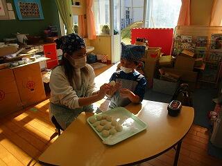 ぷれいるーむに もどり、おもちを ちぎって まるめた。