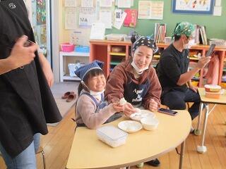 当日は、各家庭から持ち寄った材料を使って、親子でサンドイッチとサラダ作りに取り組みました。会食の時間には美味しそうに食べる姿が見られました。また、親子での出し物では、各家庭様々な趣向を凝らし楽しいひと時を過ごしました。最後に年長さんから卒業記念の「舞台」をいただきました。牛乳パックを集めて詰めて・・・と大掛かりな作業にも関わらず最後まで弱音を吐かずに力を合わせて作ったそうです。この舞台は、「お話発表会の舞台」等で活用していきます。