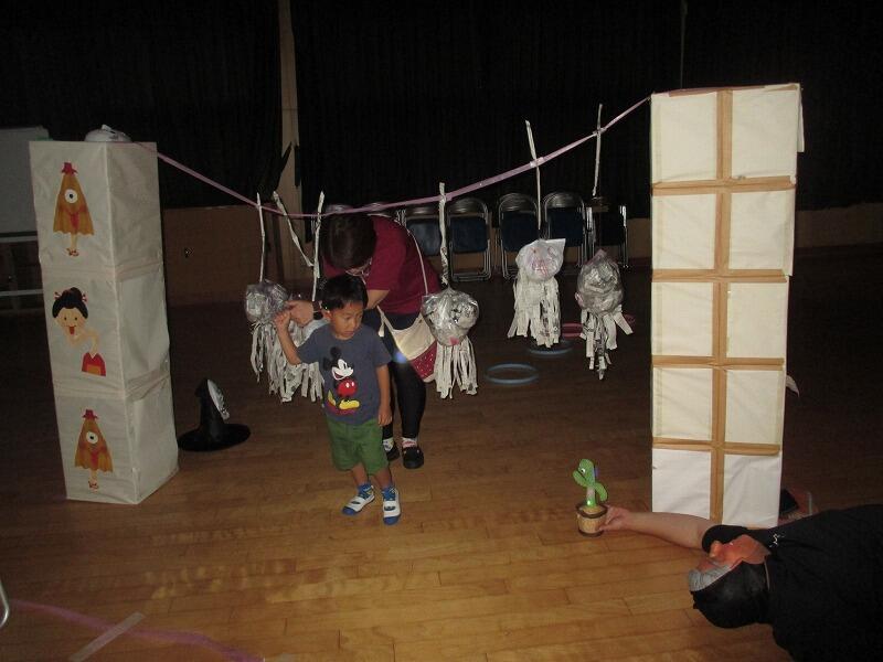 何とびっくり!おばけが出てきました。きもだめしは、怖いけど、花火をもらわなくてはいけません。がんばれ!みんな!