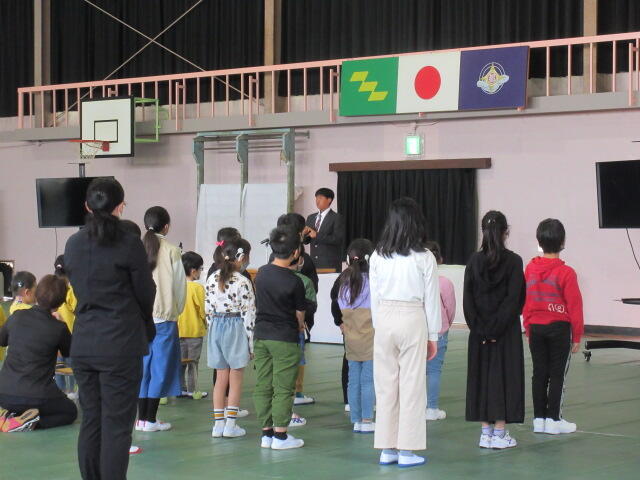 始めに、新任式が行われました。本年度は12名の先生が赴任され、子供たちも「どんな先生かな?」と興味深そう目を輝かせていました。先生方からもお一人ずつ挨拶をいただき、終始和やかな雰囲気で式を終えました。